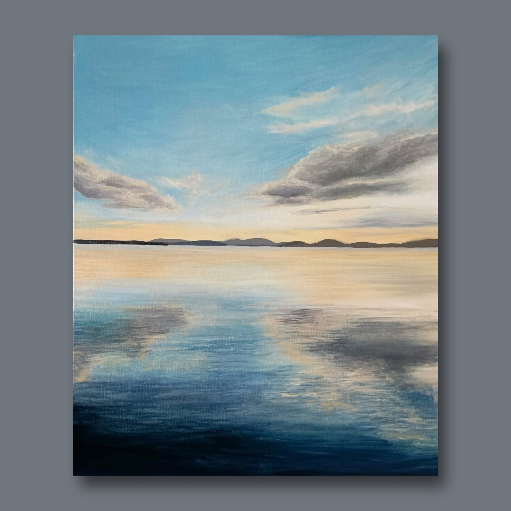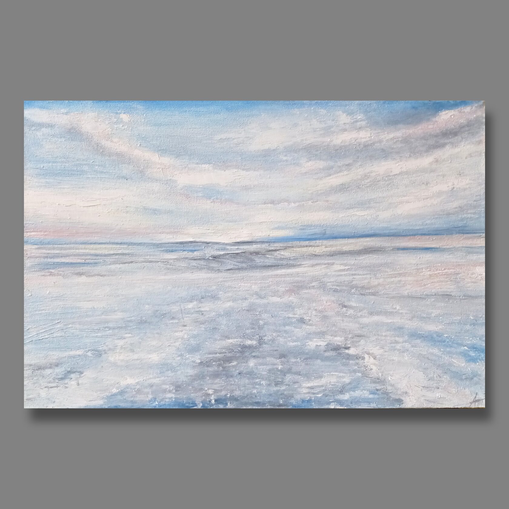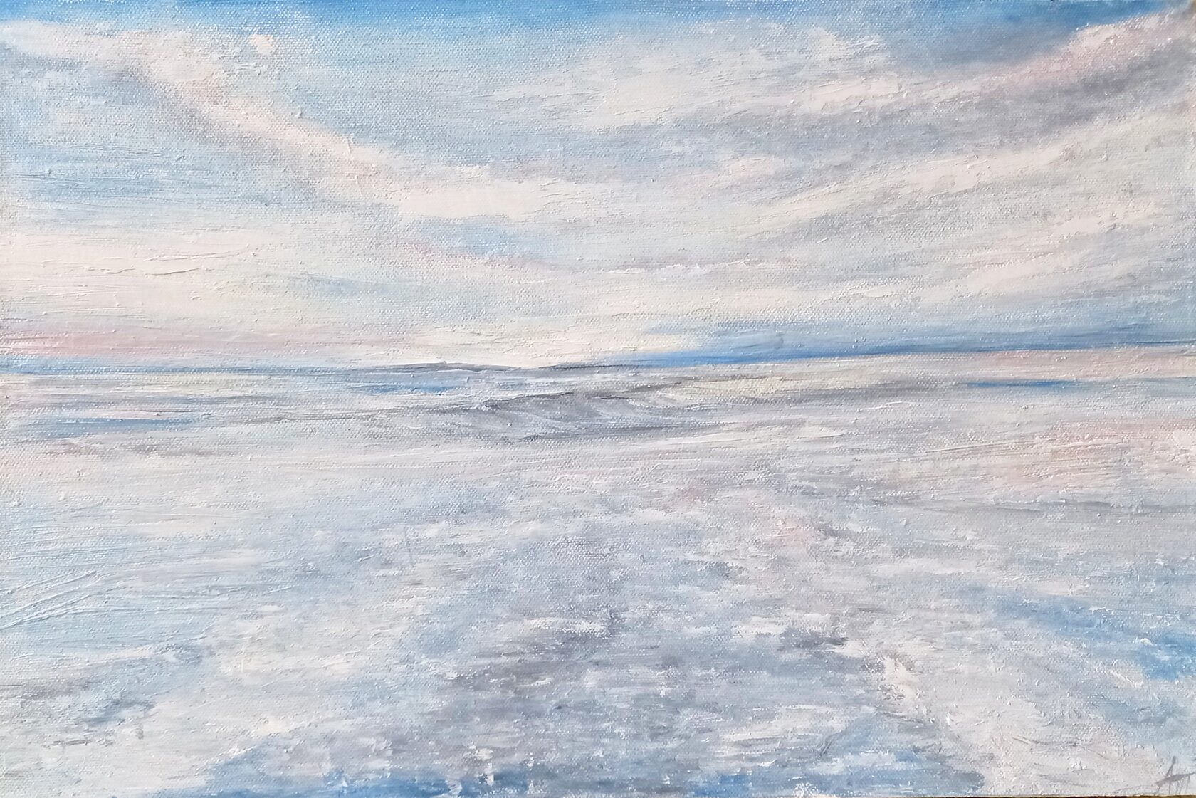 Картина "Умиротворение"-это картина об успокоении у моря. Когда смотришь в морскую даль и видишь небо в облаках и все лишние мысли рассеиваются.