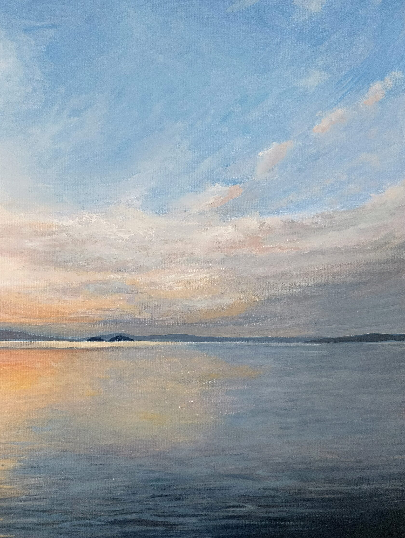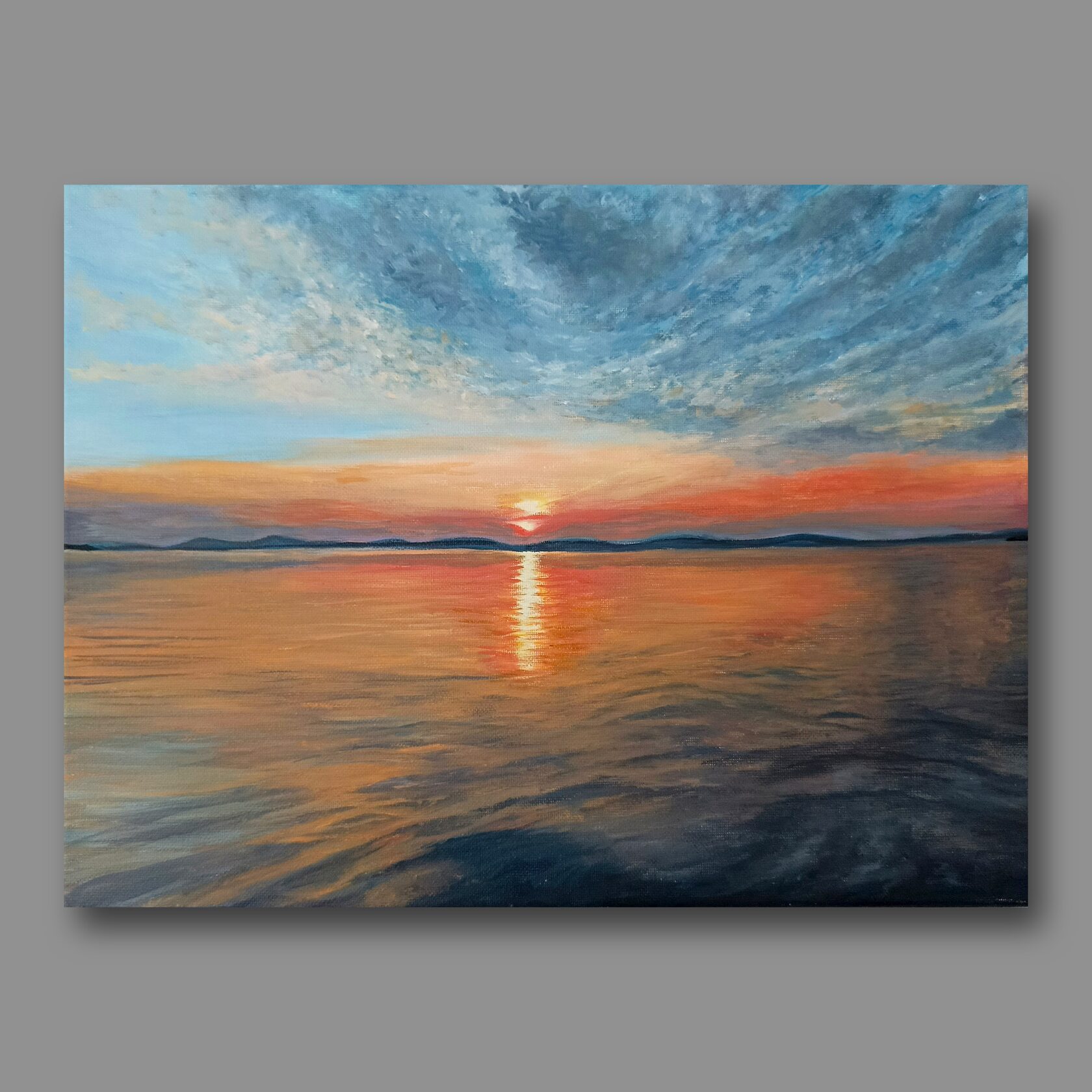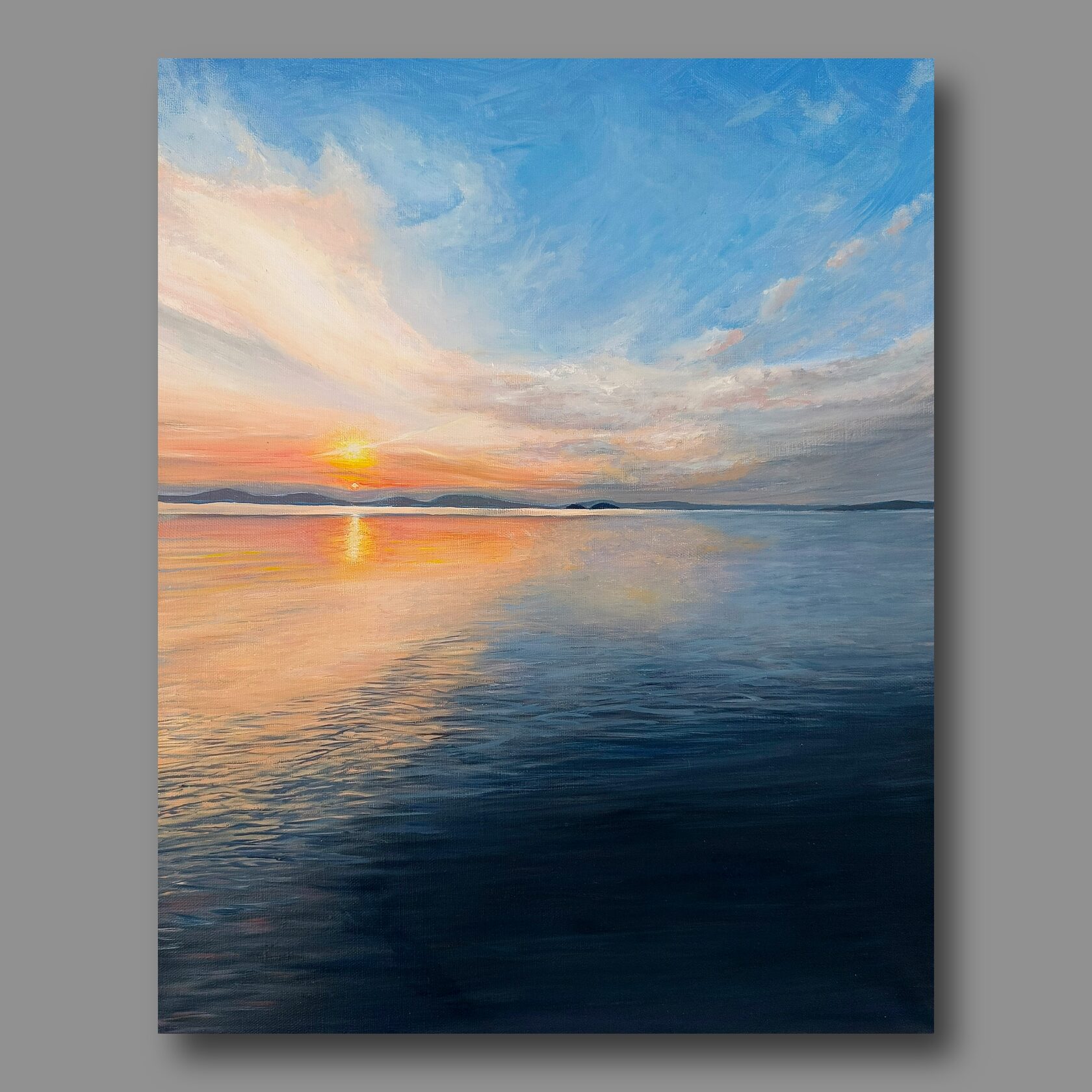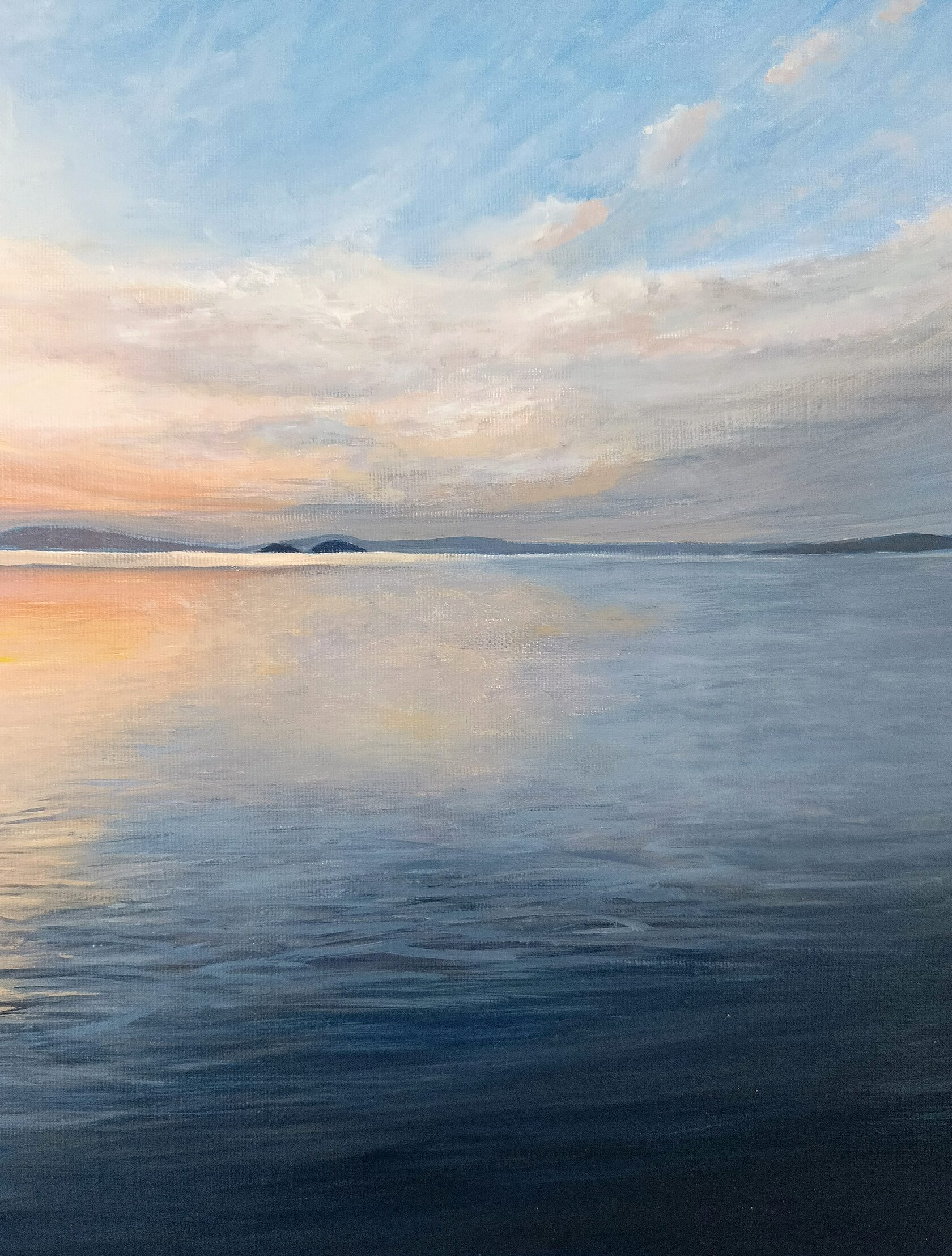 Картина "Умиротворение"-это картина об успокоении у моря. Когда смотришь в морскую даль и видишь небо в облаках и все лишние мысли рассеиваются.